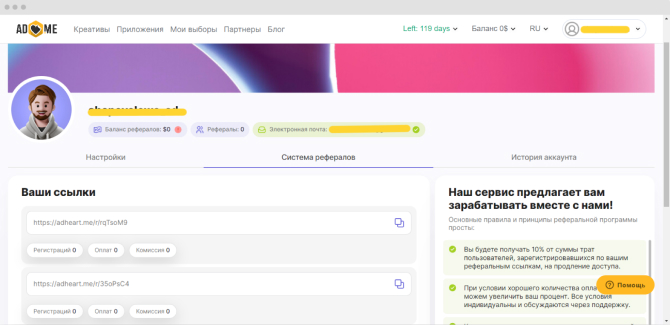 3. Find you unique referral link and use it to authorization new users in Adheart or create extra links for different traffic sources